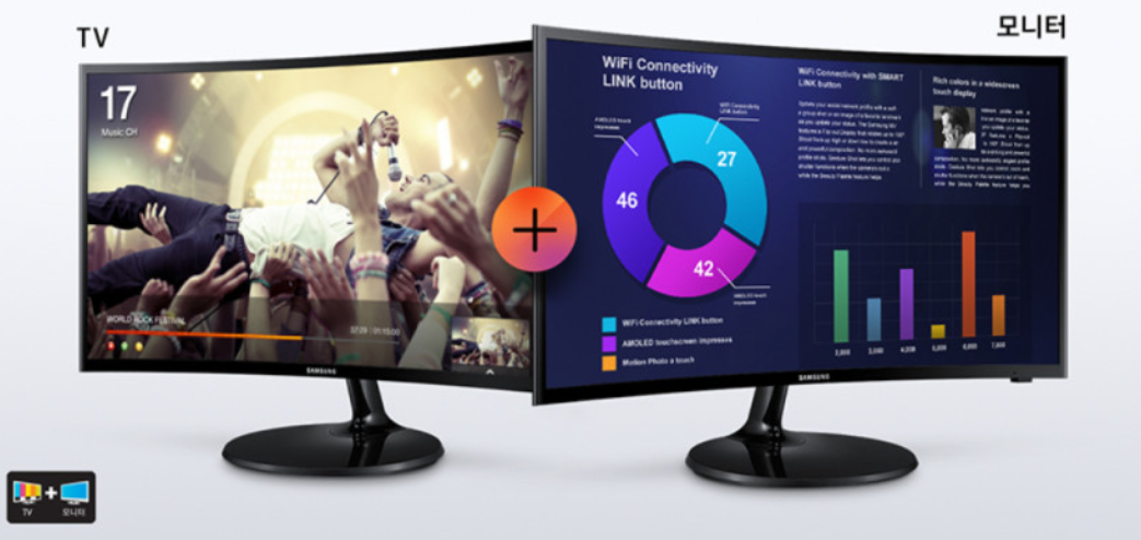 삼성사의 가성비 제품 바로 삼성 커브드 27인치 모니터입니다 커브드를 가지고 있는 제품으로 단독 모니터 사용 시에 가장 뛰어난 효과를 보여주는 제품입니다 3면 베젤리스를 가지고 있고 최대 300 니트의 밝기, FHD의 해상도를 갖고 있는 제품군중 하나입니다.